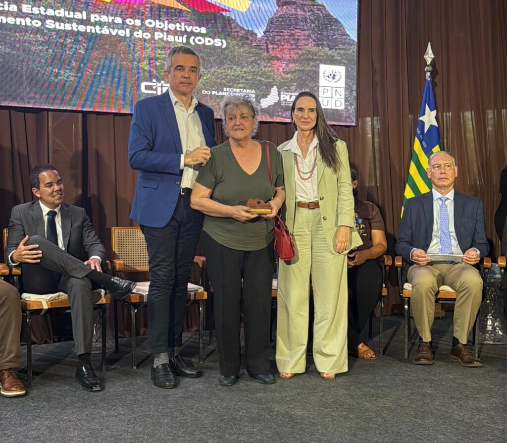 Outro momento importante do evento foi a entrega de um prêmio simbólico, das mãos do secretário Washington Bonfim e da representante do PNUD no Brasil, Maria Teresa Amaral, à senhora Rosa Maria Trakalo Nunes, administradora da Fundação Museu do Homem Americano (FUMDHAM). A homenagem faz referência ao ODS 11, que trata de cidades e comunidades sustentáveis, destacando sua contribuição para a proteção do patrimônio cultural e natural do Piauí.