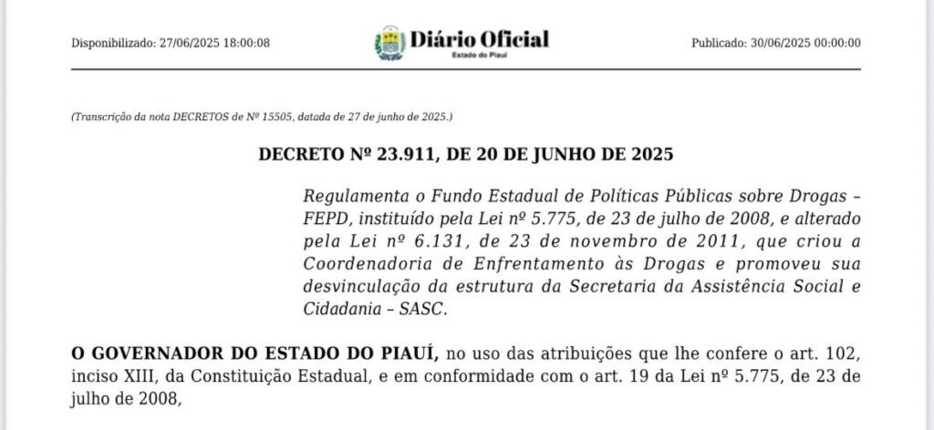 O Governo do Estado do Piauí publicou, na sexta-feira (27), o Decreto nº 23.911/2025, que regulamenta o Fundo Estadual de Políticas Públicas sobre Drogas (FEPD), criado pela Lei nº 5.775/2008 e alterado pela Lei nº 6.131/2011. Com a regulamentação, o Piauí passa a ter uma estrutura legal para captar, gerenciar e aplicar recursos financeiros destinados […]