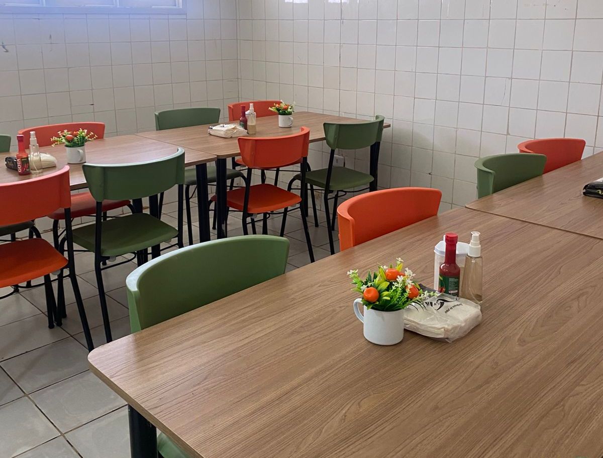 A unidade passou por uma reestruturação completa, com adequações físicas e renovação integral de equipamentos e utensílios. O refeitório foi reorganizado e agora conta com capacidade para 16 pessoas, climatização e mobiliário atualizado, proporcionando um ambiente mais funcional e adequado para as refeições.