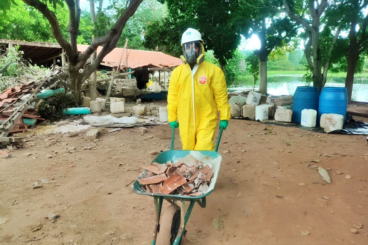 A operação de limpeza é executada por uma equipe especializada da empresa Ambipar, responsável pela coleta e descontaminação da área. O trabalho envolve a identificação e separação das embalagens intactas, a inutilização de recipientes danificados, o acondicionamento do material em bombonas específicas e a retirada de solo, galhos e outros resíduos contaminados.