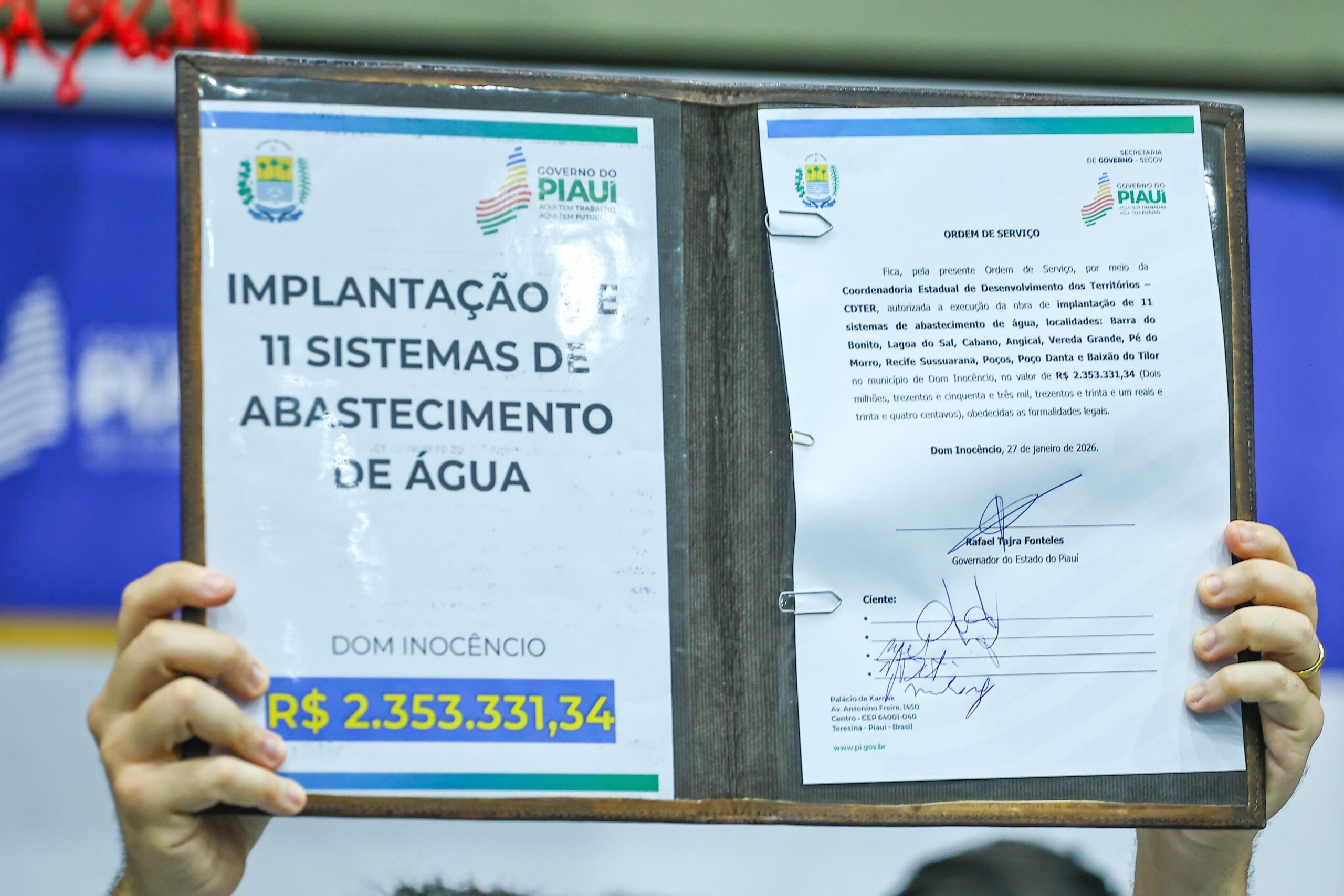 Entre as autorizações, está a execução do sistema de abastecimento de água na localidade Barreiro do Daniel, com investimento de R$ 172.447,01, sob responsabilidade da Secretaria da Irrigação e Infraestrutura Hídrica (Sefir).