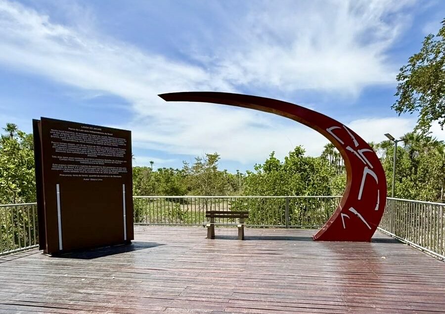A estrutura do Monumento Lagoa do Jacaré inclui um deck elevado em madeira, com área aproximada de 127,65 m², implantado de forma integrada ao ambiente natural e respeitando a vegetação existente. O espaço conta ainda com perfis metálicos, guarda-corpos, sistema de iluminação em LED, totem metálico informativo e um elemento escultórico em arco, criando um local destinado à contemplação da paisagem, ao registro fotográfico e ao uso coletivo da população.