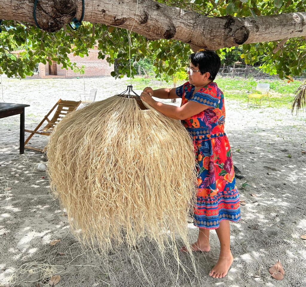 Segundo Nêda, a produção é baseada no reaproveitamento de matérias-primas encontradas na própria região. “Tem o linho da carnaúba, o linho do buriti, taboa, tábua de canoa e corda de pesca fantasma, que é o que fica dos pescadores, como a corda, rede, anzol, tudo que sobra das peças que fica no mar eu aproveito”, explica a artesã, destacando que a partir desses materiais são produzidas luminárias, bolsas, tapeçarias e peças decorativas.