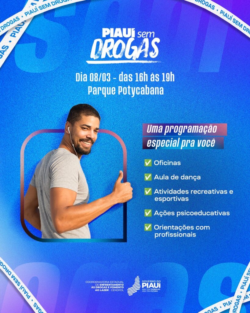 O projeto “Piauí Sem Drogas” convida a população para um evento gratuito e aberto ao público no dia 8 de março, das 16h às 19h, no Parque Potycabana, em Teresina. O evento tem como objetivo principal sensibilizar sobre os perigos do uso de drogas e promover um estilo de vida saudável.