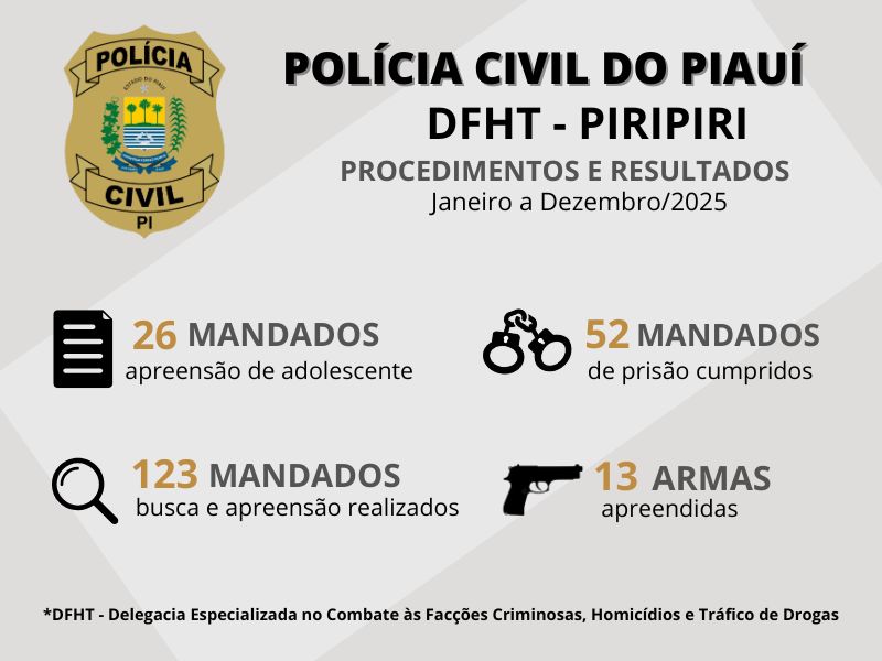 Para o delegado-titular da unidade policial, Lucas Klinger, os dados traduzem o empenho da DFHT no combate à criminalidade. “Os resultados reforçam o compromisso da DFHT e da Polícia Civil com a investigação qualificada e a defesa da sociedade, bem como a importância da integração institucional, que seguirá sendo fortalecida em 2026 para a manutenção dos avanços alcançados na segurança pública de Piripiri”, destacou.