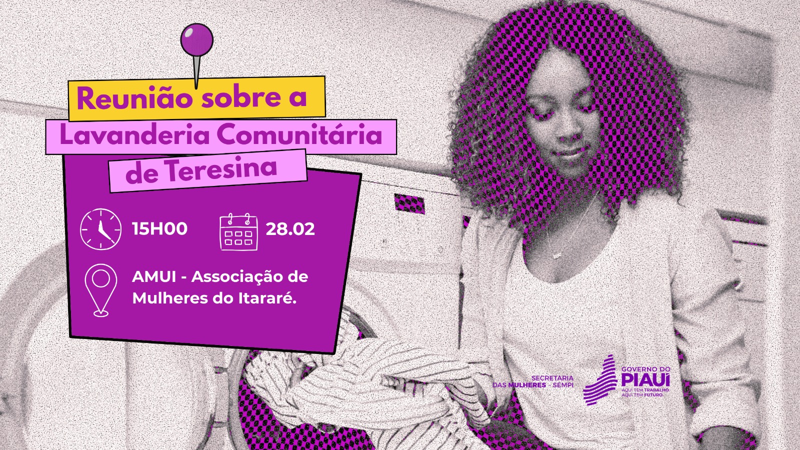 A Secretaria das Mulheres do Piauí (Sempi) vai realizar, no dia 28 de fevereiro, uma reunião para apresentar e discutir a implantação de uma lavanderia comunitária na zona Sudeste de Teresina. O encontro acontece às 15h, na sede da Associação de Mulheres do Itararé (AMUI), localizada na Rua Doutor Pedro Teixeira, nº 3373, no bairro Itararé. Todas as moradoras da região interessadas em conhecer o projeto estão convidadas.