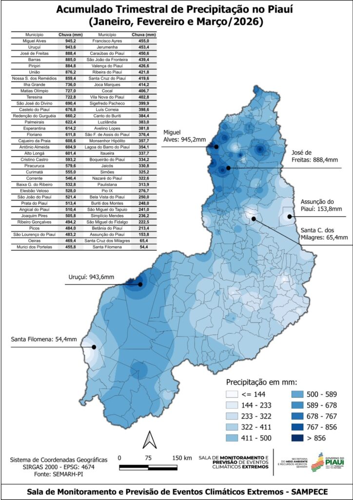 Apesar do trimestre corresponder ao principal período chuvoso, municípios do semiárido, como Santa Cruz dos Milagres e Assunção do Piauí, registraram baixos acumulados, reforçando a característica de irregularidade das chuvas no estado.