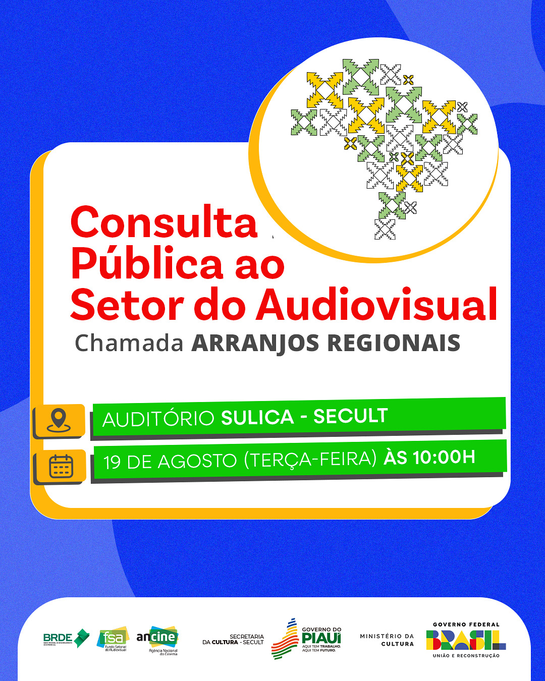 A Secretaria de Estado da Cultura do Piauí (Secult-PI) realiza, nesta terça-feira (19), uma consulta pública sobre os Arranjos Regionais do Fundo Setorial do Audiovisual (FSA). Será às 10h, no Auditório Sulica, localizado na sede da secretaria, em Teresina.