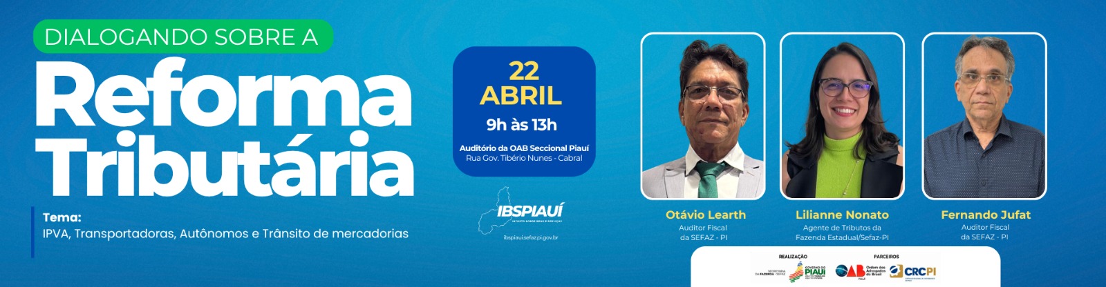A Secretaria de Estado da Fazenda do Piauí (Sefaz-PI) promove, na quarta-feira (22), a 6ª edição do Dialogando Sobre a Reforma Tributária. O evento ocorre das 9h às 13h, no auditório da OAB-PI, com transmissão ao vivo pelo canal da Fundação/TV Antares no YouTube, por meio do link. Esta edição terá como tema central IPVA, Transportadoras, Autônomos e Trânsito de Mercadorias.