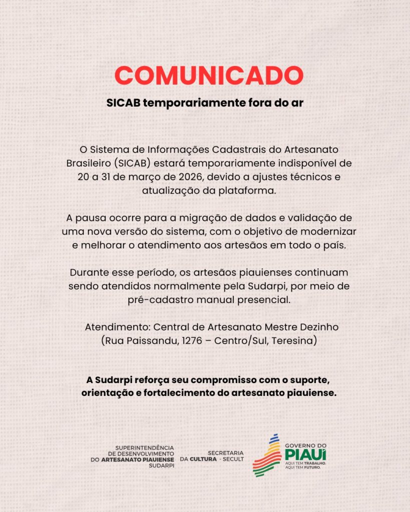Durante o período de indisponibilidade do sistema nacional, os artesãos piauienses continuam sendo atendidos normalmente pela Superintendência de Desenvolvimento do Artesanato Piauiense (Sudarpi), por meio do pré-cadastro manual, garantindo a continuidade dos serviços e o acesso às políticas públicas do setor.