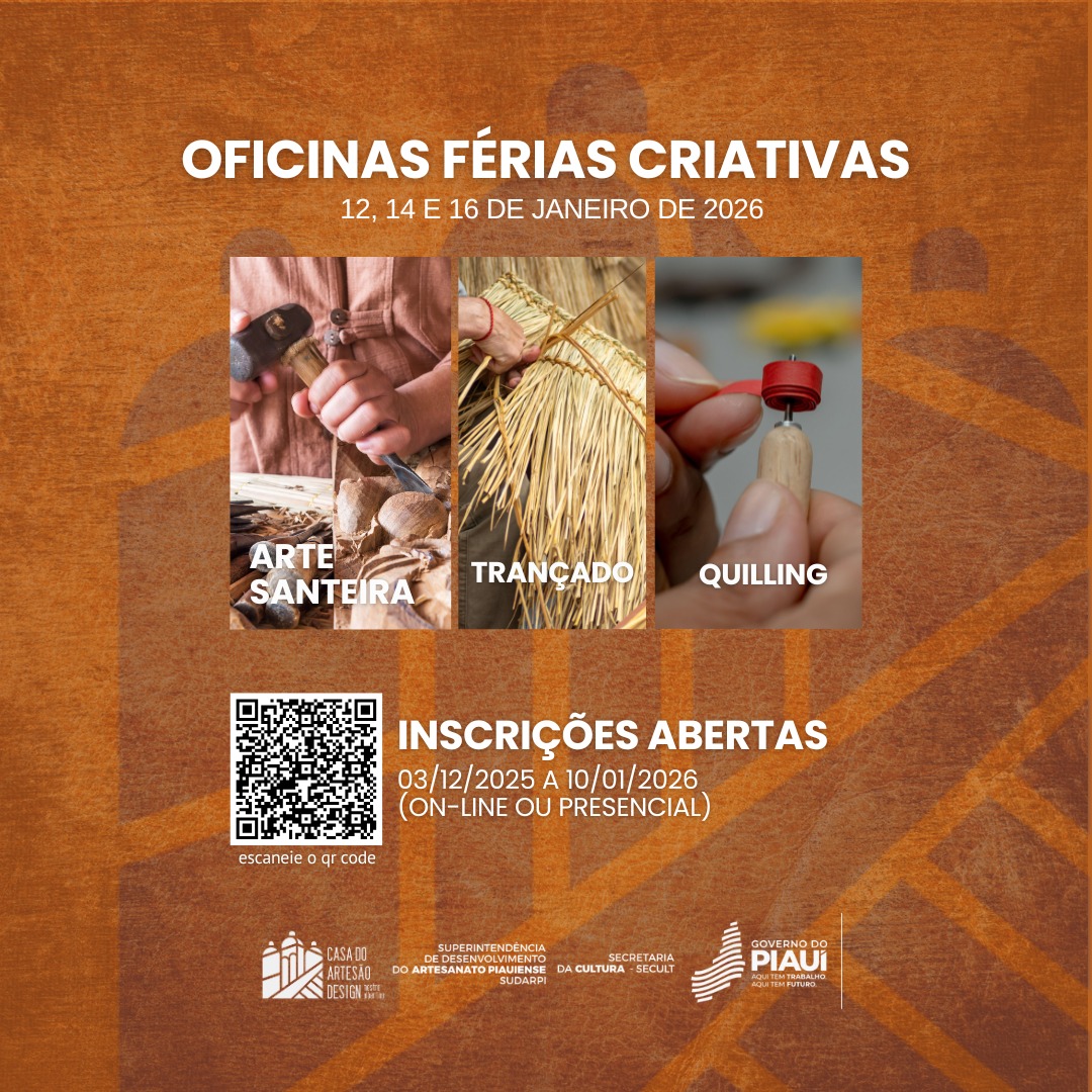 A Secretaria de Estado da Cultura (Secult), por meio da Superintendência de Desenvolvimento do Artesanato Piauiense (Sudarpi), abriu as inscrições para as oficinas Férias Criativa, programação especial que será realizada em janeiro de 2026, na Casa do Artesão Design Mestre Albertino, em Teresina.
